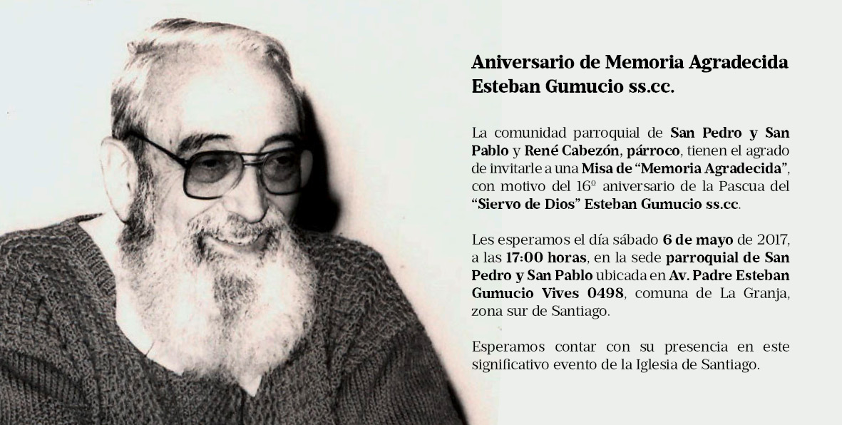 El próximo sábado 6 de mayo, en el memorial del padre Esteban Gumucio ubicado en la Parroquia San Pedro y San Pablo, celebraremos la eucaristía para conmemorar un año más de su pascua, que coincide con la celebración del buen pastor, tal como fue el domingo que Esteban partió a la casa del Padre.