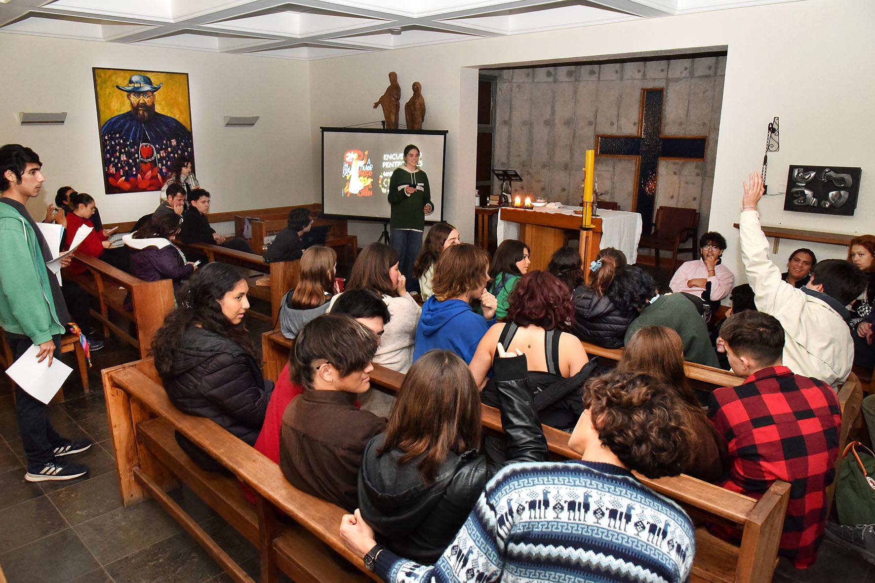 Luego vino el momento más espiritual, donde todos ingresaron a la capilla y nuestro hermano Oscar Casanova sscc, comentó a los jóvenes sobre el significado de Pentecostés y el Espíritu Santo: “Esta es la ocasión para hacer algo nuevo, hacer vibrar el corazón, transformarnos y encontramos como jóvenes que compartimos el mismo carisma, pidamos al Espíritu Santo que fluya entre nosotros, que nos ayude a comprender lo distinto y ofrecernos para estrechar lazos”, comentó Oscar, después de leer el texto sobre Pentecostés (Hechos 2, 1-12).