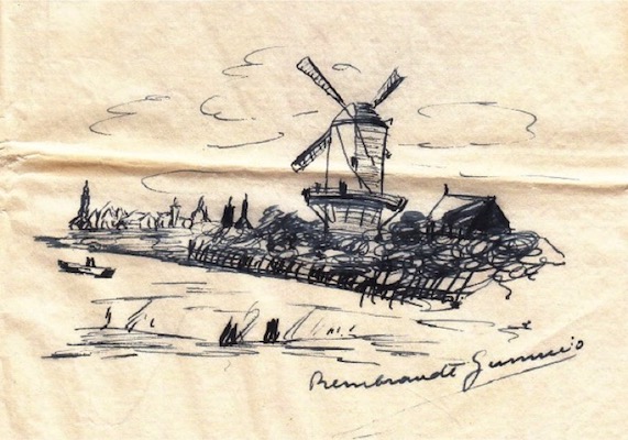 Me gustaría añadir que en las cartas a los miembros de su familia Esteban despliega un rasgo juguetón, propio del maravilloso niño que siempre fue. En el viaje a Holanda para el capítulo de 1947 conoce algunos lugares, entre ellos Amsterdam. Ahí visita el famoso Reijksmuseum y se embelesa con los muchos cuadros de Rembrandt que puede contemplar. A su hermano Vicente se los describe con detalle en una carta en la que le incluye un dibujo que firma “Rembrandt Gumucio”: